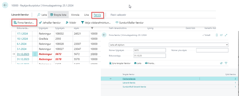 Í öllum færslugluggum er aðgerð sem heitir færsluleit en hún leitar í öllum undirkerfum að tengdum færslum.