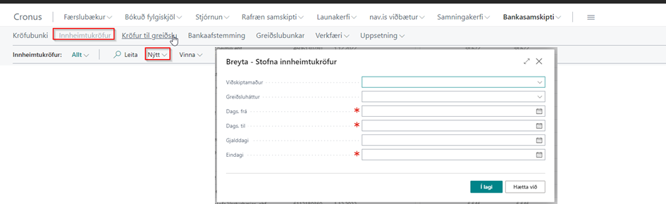 Smella á í lagi til að stofna. Að lokum er ýtt á senda í banka til þess að stofna kröfurnar í bankanum.