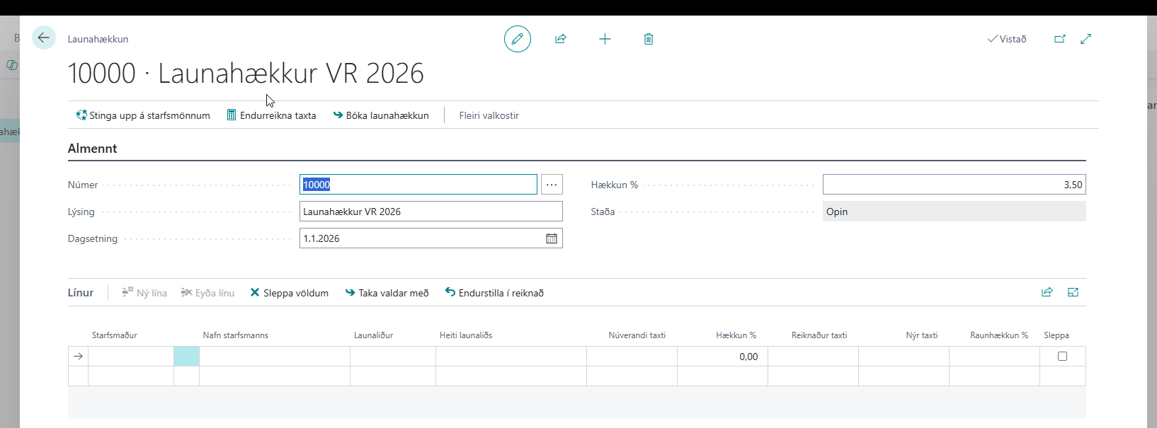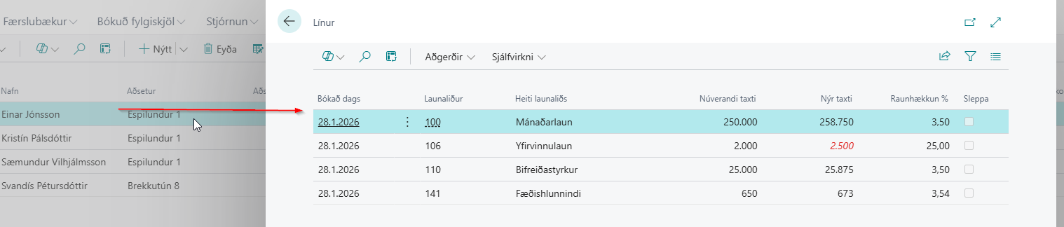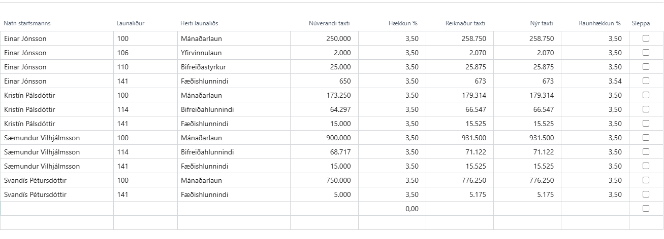 þá koma allar launalínur virkra starfsmanna inn og vinnslan stingur uppá fjárhæð mv. hækkun %