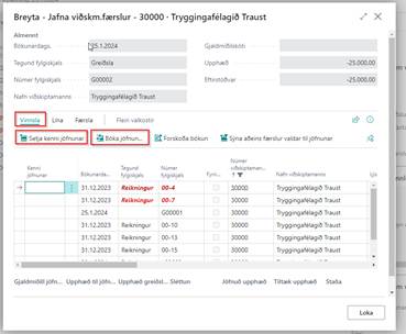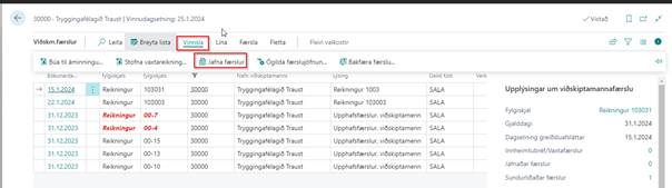 Þá sjáum við allar færslur sem hafa átt sér stað. Fyrst veljum við greiðslufærsluna (eða kreditfærsluna) sem er opin og smellum á aðgerðir / jafna færslu þá opnast jafna viðskm. færslur